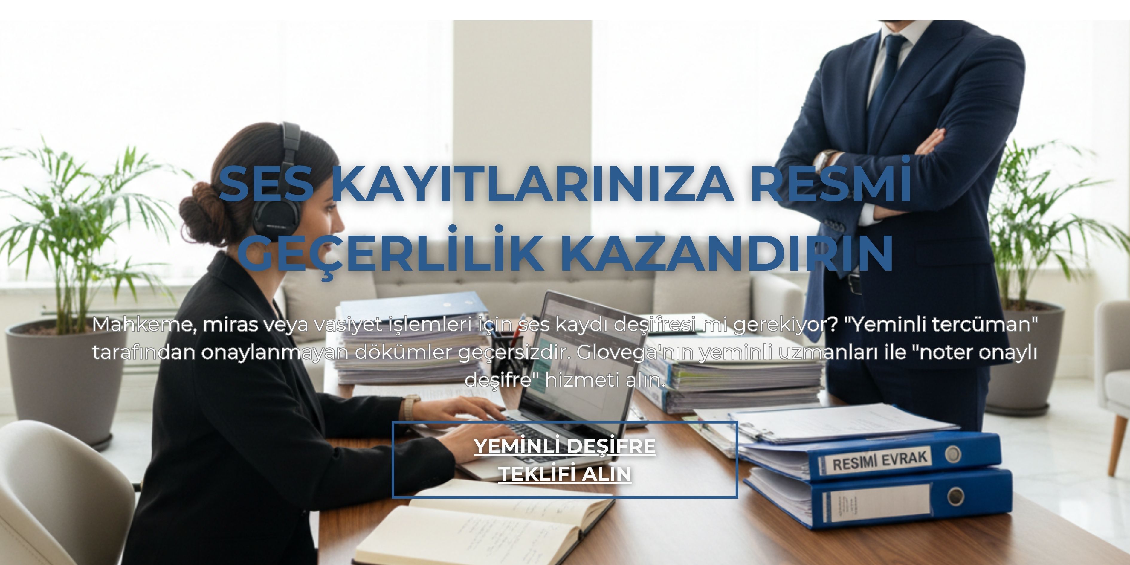Bu nedenle, bir ses kaydının "resmi evrak" niteliği kazanması için, o işlemi yapacak olan "yeminli deşifre uzmanı"nın (ki bu kişi noter yeminli tercümandır) yetkinliği şarttır. Glovega, bu "yeminli deşifre uzmanı" kadrosuna ve noter süreçleri deneyimine sahiptir.